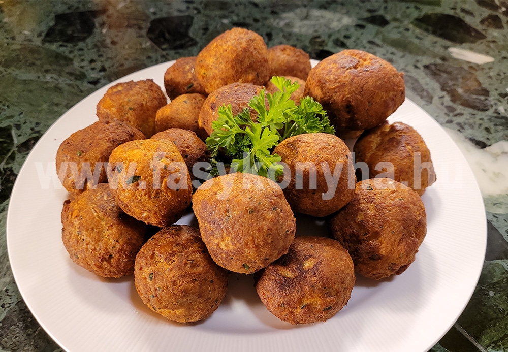 A zsemléket felszeleteljük, rövid ideig vízbe áztatjuk majd kinyomkodjuk. Az olaj és a kockázott sajt kivételével a többi hozzávalóval összegyúrjuk, sóval, borssal ízesítjük. Nedves kézzel pogácsát készítünk belőle, a közepébe belehelyezzük a sajtkockát, majd a két tenyerünk között kis golyót formázzunk, azután forró olajba téve aranybarnára sütjük őket.
