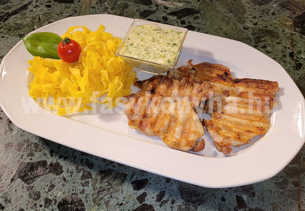 A csirkecombfilét folpackon keresztül kiklopfoljuk, sózzuk, olajjal bekenjük és kontakt grillsütővel megsütjük. A vajat megolvasztjuk , liszttel megszórjuk, tejjel felöntjük, krémesre főzzük, hozzáadjuk a finomra vágott medvehagymát, sóval, borssal ízesítjük. Egy forralás után esztétikusan üvegtálkában tálaljuk a roston sült csirkehús és a menetközben enyhén sós vízben kifőzött tésztával.