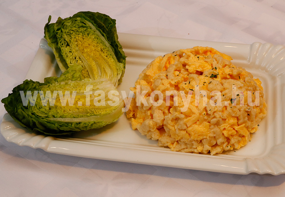 Négy tojást a liszttel simára keverünk és sóval ízesítjük. A tésztát 2 liter forrásban lévő enyhén sós vízbe galuskaszaggatóval beleszaggatjuk, és addig főzzük, míg a galuskák a víz tetejére feljönnek, majd leszűrjük. Olajon a galuskát felhevítjük, állandó kevergetés mellett hozzáöntjük az enyhén sóval ízesített, felvert tojásokat és készre sütjük. Menet közben 1 dl langyos vizet ecettel, cukorral és sóval ízesítünk, azután belerakjuk a félrevágott salátafejeket és tálalásig hűben tároljuk. A tojásos galuskát formázva, esztétikusan kínáljuk az ecetes salátával.