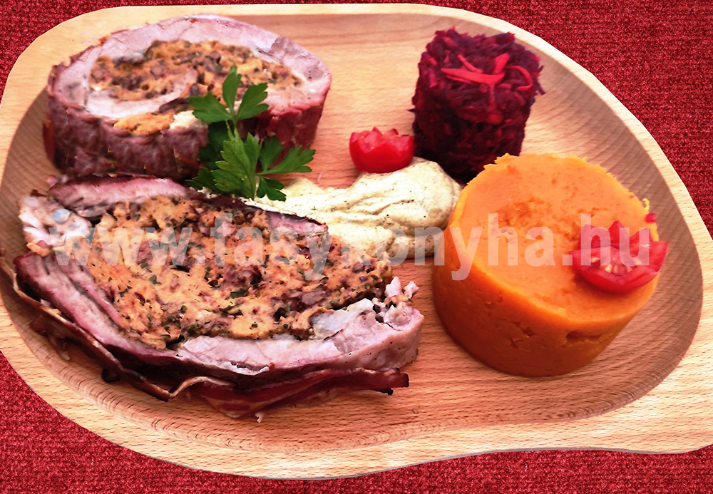 A sertésdagadót sóval bedörzsöljük azután állni hagyjuk. A zsemléket beáztatjuk majd kinyomkodjuk. A májat és a füstölt tarját ledaráljuk. A hagymát, a petrezselymet finomra vágjuk, a fokhagymát összezúzzuk és olajon megdinszteljük. Az egészet tálba rakjuk, a tojást ráütjük, sóval, borssal, paprikával, majorannával ízesítjük, összekeverjük, majd beletöltjük a dagadóba, és a nyílást hústűvel összetűzzük. Tepsibe helyezzük, olajjal meglocsoljuk, 1 dl vízzel felöntjük, alufóliával hermetikusan lezárjuk. 200 °C-os előmelegített sütőben, kb. 60 percig pároljuk, majd levesszük a fóliát, és mindkét oldalát pirosra sütjük. A megsült dagadót néhány percig pihentetjük, ujjnyi vastagra szeleteljük, majd a párolt káposztával és a paprikás tört burgonyával esztétikusan tálaljuk.