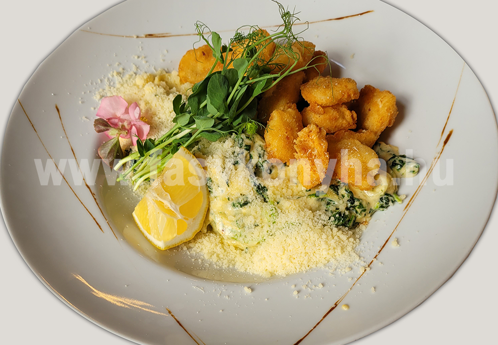 A karfiolt apró rózsáira szedjük, enyhén sós vízben megfőzzük, lecsepegtetjük és félrerakjuk. Emellett a metélt tésztát is enyhén sós vízben megfőzzük, leszűrjük és félrerakjuk. A vajat felhevítjük, hozzáadjuk a karikákra vágott fokhagymát, a tépkedett spenótleveleket, majd megszórjuk liszttel, egy keverés után tejjel felöntjük, krémesre főzzük, sóval ízesítjük és összekeverjük a tésztával. Közben a kihűlt karfiolrózsákat lisztben, majd az enyhén sós felvert tojásban és a zsemlemorzsában megforgatjuk, azután forró olajban aranybarnára sütjük. Spenótos tésztával, zöldborsócsírával, parmezánnal megszórva és citrommal meglocsolva tálaljuk.