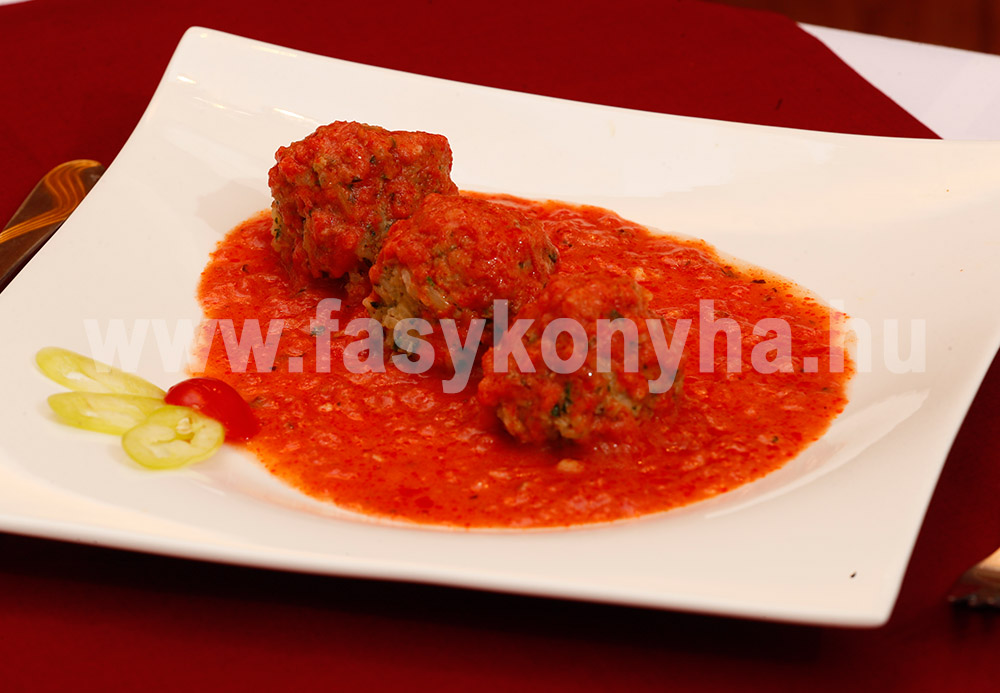 A megfőtt rizst összegyúrjuk a darált hússal, a tojásokkal, a zúzott fokhagymával, sóval, borssal ízesítjük. Gombócokat formázunk belőle és enyhén sós vízben megfőzzük. A finomra vágott hagymát és a bazsalikomleveleket, a leforrázott héjától megtisztított paradicsommal olajon megdinszteljük, liszttel meghintjük, összekeverjük, cukorral, sóval ízesítjük, paradicsomlével felöntjük és krémesre főzzük! Belerakjuk a húsgombócokat és egy forralás után esztétikusan tálaljuk! Tetszés szerint, főtt burgonyával is kínálhatjuk.
