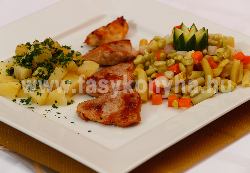 A szűzérmét lehártyázzuk, felszeleteljük, sóval ízesítjük, lisztbe megforgatjuk, majd olajon mindkét oldalát aranybarnára sütjük. A zöldségmixet és a meghámozott, kockákra vágott burgonyát külön-külön enyhén sós vízben megfőzzük, azután vajban megpároljuk. Végezetül friss petrezselyemzölddel megszórva esztétikusan köretként tálaljuk a hús mellé.
