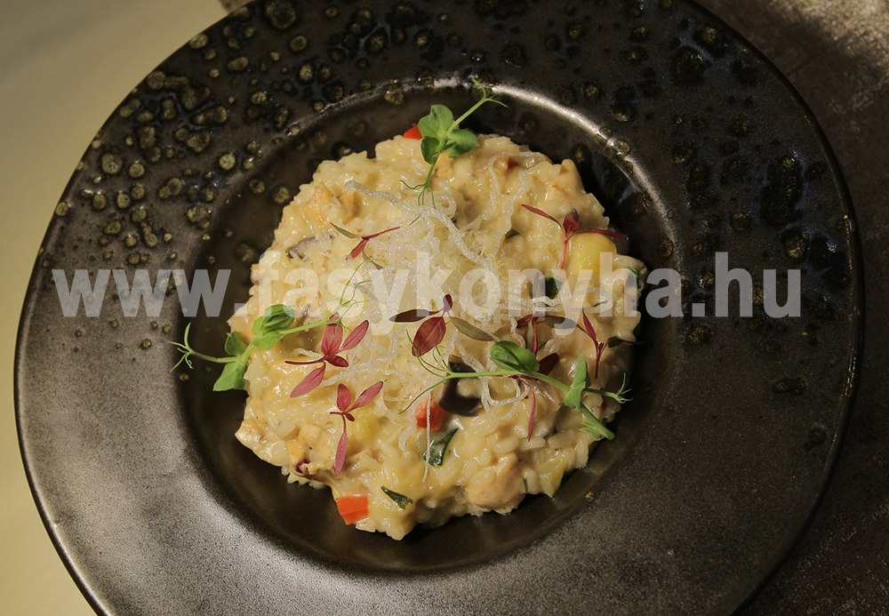 Vízben feltesszük főni a megtisztított, apróra vágott sárgarépát, a zöldséget és 1 fej vöröshagymát, ha kész leszürjük (ez lesz a rizottonak a felöntő leve). Közben egy serpenyőben a finomra vágott hagymát olívaolajon üvegesre dinszteljük, hozzáadjuk a rizotto rizst, kislángon fehéredésig pirítjuk, felöntjük fehérborral, majd állandó kevergetés mellett hozzá adagolunk az alapelvünkből, amíg a rizs belül még roppan, de a külseje már puha lesz, sóval, borssal ízesítjük, azután félrerakjuk. Közben a csirkemellet és a többi zöldséget 1x1 cm-es kockákra vágjuk, egy serpenyőben olívaolajon megpirítjuk, majd összekeverjük a rizzsel, hozzáadjuk a vajat, felöntjük a maradék alaplével, egy forralás után hozzáadjuk a reszelt parmezánt, a kéksajtot, és finom mozdulatokkal a serpenyőben megforgatjuk, hogy selymesebb állagot kapjunk. Esztétikusan díszítve tálaljuk.