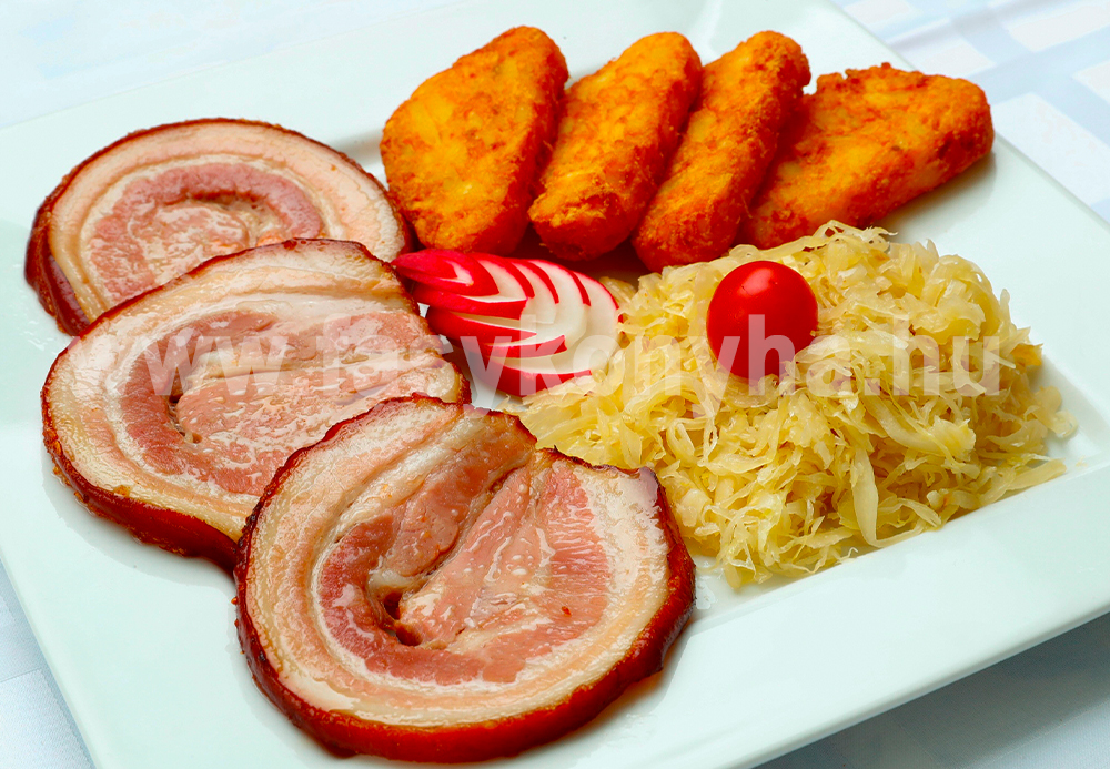 A szalonnát téglalapra vágjuk, mindkét oldalát sóval, borssal bedörzsöljük. Bőrös oldalára kiterítjük, zúzott fokhagymával bedörzsöljük, feltekerjük és spárgával 1 cm-enként megkötözzük. Alufóliára helyezzük, olajjal meglocsoljuk, majd hermetikusan becsomagoljuk. Tepsibe rakjuk, 2 dl vizet öntünk alá, és 200 °C-os sütőben 45 percig előpároljuk. Kicsomagoljuk, meglocsoljuk sörrel és ropogósra sütjük. A pecsenyelevet a tepsiből szűrön keresztül tálkába öntjük, és félrerakjuk. A húsról levágjuk a madzagot, majd éles késsel egyenlő szeletekre vágjuk. A káposztát a pecsenyelében megpároljuk, a ropogós malacsült és a röszti mellé tálaljuk. Esztétikusan díszítjük retekkel és koktélparadicsommal.