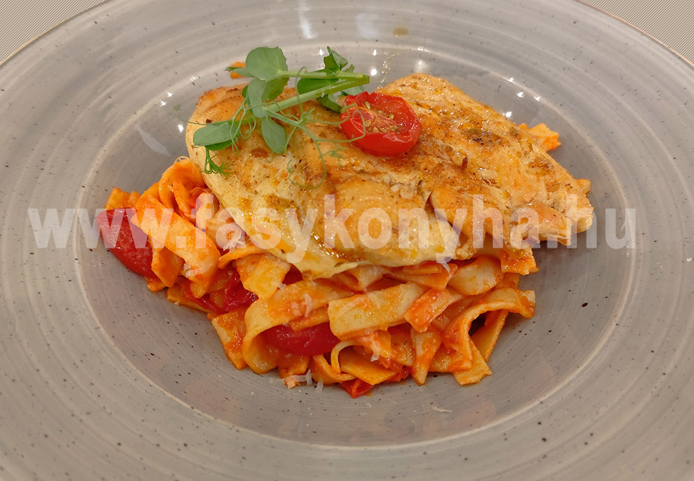 A csirkemellfilét szeletekre vágjuk, folpackon keresztül kiklopfoljuk, sózzuk, olajjal bekenjük és kontakt grillsütővel megsütjük. A hagymát és a friss oregánót finomra, a fokhagymát karikákra vágjuk, majd olívaolajon megdinszteljük, hozzáadjuk a forrázott, héjától megtisztított paradicsomokat, meghintjük parmezán sajttal, majd felöntjük paradicsomlével, sóval ízesítjük és állandó kevergetés mellett 20 percig krémesre forraljuk. Közben a tésztát enyhén sós vízben kifőzzük, lecsepegtetjük és összekeverjük a paradicsomos mártással. A sülthúst a paradicsomos metéltre esztétikusan díszítve tálaljuk.