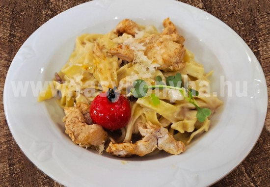 A csirkemellfilét darabokra vágjuk, sózzuk, olajjal meglocsoljuk, és serpenyőben puhára pároljuk. Közben egy másik edényben felhevítjük a vajat, hozzáadjuk a karikákra vágott fokhagymát, a reszelt sajtot és felöntjük tejszínnel, majd krémesre főzzük, végül beleforgatjuk a csirkemell falatokat. Közben a tésztát enyhén sós vízben kifőzzük, lecsepegtetjük, majd hozzákeverjük a sajtos csirkemell falatokhoz és egy forralás után forrón, sült koktélparadicsommal, zöldborsócsírával, parmezánsajttal meghintve tálaljuk.
