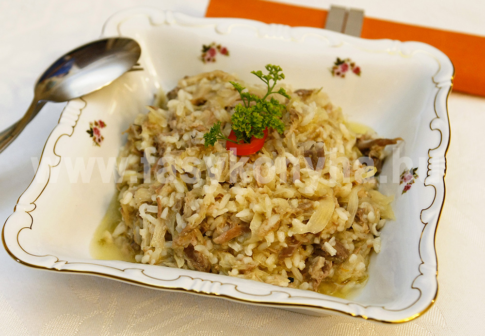 Az aprólékokat megtisztítjuk, átmossuk, beletesszük egy fazékba, felöntjük vízzel és felforraljuk. A levet leöntjük róla, majd ismét felöntjük 1 l vízzel, visszatesszük a tűzhelyre, majd belehelyezzük a tisztított zöldségeket és a fűszereket. Lassú tűzön kb. 3 óra alatt puhára főzzük. Menet közben merőkanállal a zsírt leszedjük a leves tetejéről egy lábasba, azután a savanyú káposztát belerakjuk és fedő alatt puhára pároljuk. A kész levest szűrőn keresztül leszűrjük. A szárnyakról a húst lefejtjük és kockákra vágjuk a belsőségekkel és a zöldségekkel együtt. A levesbe belerakjuk a rizst, állandó kevergetés mellett puhára főzzük, majd belerakjuk a káposztát, a kockázott húsokat, a belsőségeket, a zöldségeket és összekeverjük. Konyharuhával lefedjük, fedőt tesszük rá. 10-15 perc után tálaljuk.
