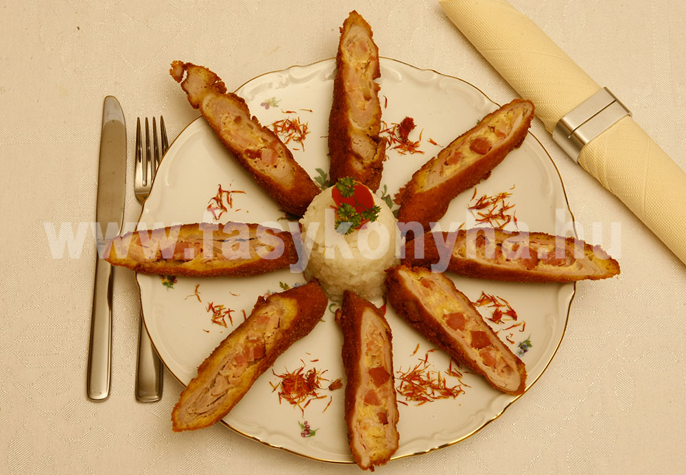 A füstölt csülköt 8 órán át vízben áztatjuk, majd puhára főzzük, a bőrét lefejtjük és apró darabokra vágjuk. Menet közben a pulykamellet 8 szeletre vágjuk, folpackon keresztül vékonyra kiklopfoljuk. Sóval enyhén meghintjük. Az apróra vágott füstölt húst összegyúrjuk a reszelt sajttal, a tojással és egyenként elosztjuk a hússzeletekre, majd feltekerjük. A tojásokat habosra felverjük, csipet sóval ízesítjük, azután a töltött húst belemártjuk, azt követően zsemlemorzsában megforgatjuk. Forró olajban aranybarnára sütjük. Esztétikusan rizzsel tálaljuk.