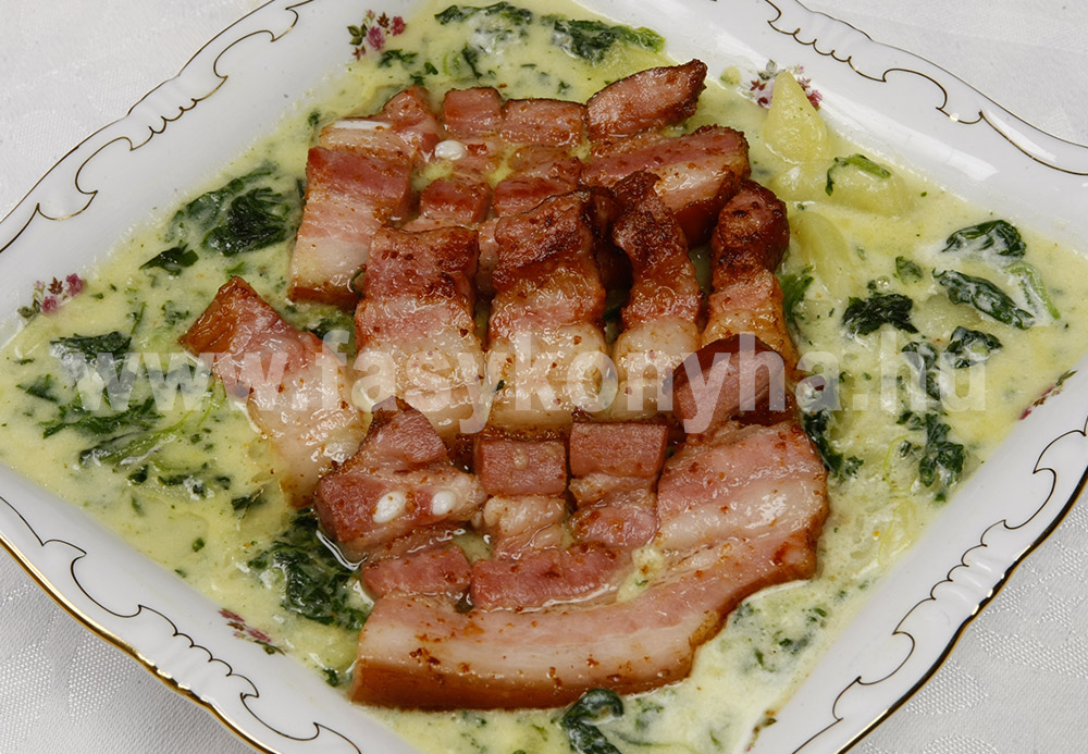 A karikára vágott tisztított burgonyát egy lábasba rakjuk, majd annyi vizet adunk hozzá, hogy ellepje. Sóval, őrölt babérlevéllel ízesítjük és puhára főzzük. Vajon az apróra tépkedett spenótot és a karikákra vágott fokhagymát megdinszteljük, majd meghintjük liszttel. Állandó kevergetés mellett felöntjük tejjel és a simára kevert tejföllel, felforraljuk azután hozzáadjuk a burgonyához és készre főzzük. Menet közben a császárszalonnát négyfelé szeleteljük, majd keresztbe bevagdaljuk, olajon mindkét oldalát szép pirosra sütjük és mintegy kakastaréj díszként tálaljuk a spenótos főzelékre.