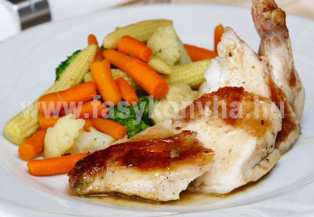 Elkészítési mód:A 2 db egész csirkemellet négyfelé osztjuk. Olívaolajjal bedörzsöljük, sóval, fehér borssal ízesítjük és teflon serpenyőben alacsony lángon mindegyik oldalát megsütjük, menet közben, hogy ne legyen száraz, fehér borral locsolgatjuk. Mézzel bekenjük és aranybarnára pirítjuk. A vokzöldségeket enyhén sós vízbe félpuhára főzzük, majd a felhevített vajon fedő alatt rövid idő alatt megpároljuk. A csirkemellet felszeleteljük és ízlésesen tálaljuk a zöldségekkel.