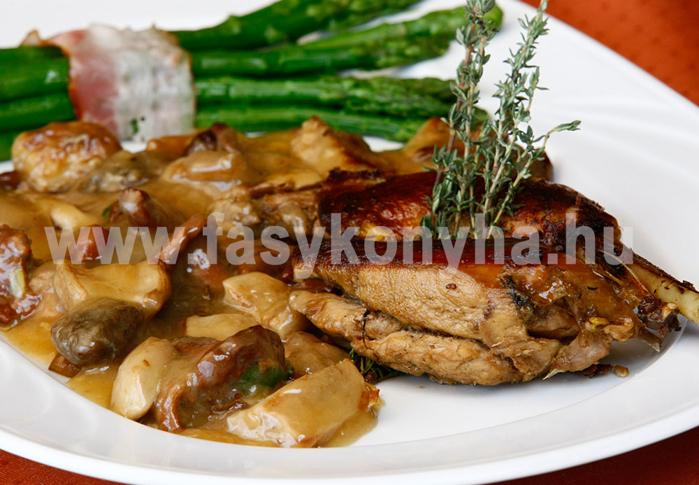 A jól megtisztított fácánt egészben a tisztított vöröshagymával, a fokhagymával, a zellerrel és a kakukkfűvel enyhén sós vízben félpuhára főzzük, a levét leszűrjük és félrerakjuk. A spárgát 10-15 perc alatt vízben félpuhára főzzük és baconszalonnába tekerjük. A félig főtt fácánt feldaraboljuk, sóval meghintjük, tepsibe rakjuk, a baconszalonnába tekert spárgával együtt, olívaolajjal meglocsoljuk és 150 °C előmelegített sütőben szép pirosra sütjük. A vargányagombát apróra vágjuk, olívaolajon lepirítjuk, liszttel megszórjuk, majd a leszűrt fácánhús levével felöntjük és puhára pároljuk. Az egészet esztétikusan tálaljuk, friss kakukkfűvel díszítjük.