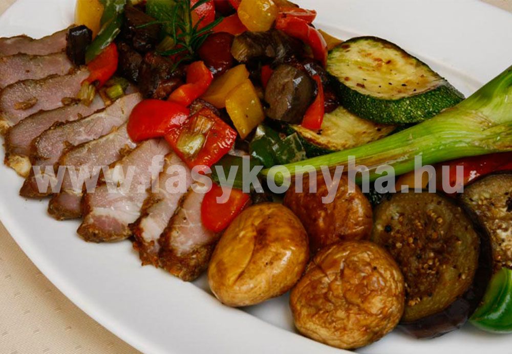 Egy edényben az olívaolajat felforrósítjuk, és hozzáadjuk a fokhagymát, a vöröshagymát, a petrezselyemzöldet, majd egészbe belerakjuk a sóval és borssal bedörzsölt sertéscombot. Folyamatosan átforgatjuk úgy, hogy mindenhol kifehéredjen. Felöntjük annyi vízzel, hogy ellepje, és félpuhára főzzük, majd előmelegített 150 °C-os sütőben szép aranybarnára sütjük. A májat és a paprikát kockákra vágjuk, megmossuk, serpenyőbe rakjuk, kevés olajjal meglocsoljuk, friss rozmaringgal, szegfűszeggel és fahéjjal illatosítjuk. Fedő alatt megpároljuk és sóval ízesítjük. Menet közben a padlizsánt és a cukkinit karikákra vágjuk, majd az újhagymával és a gombafejekkel együtt mind a két oldalát roston megsütjük. Az egészben sült pecsenyét éles késsel felszeleteljük, különleges májraguval és roston sült zöldségekkel tálaljuk.