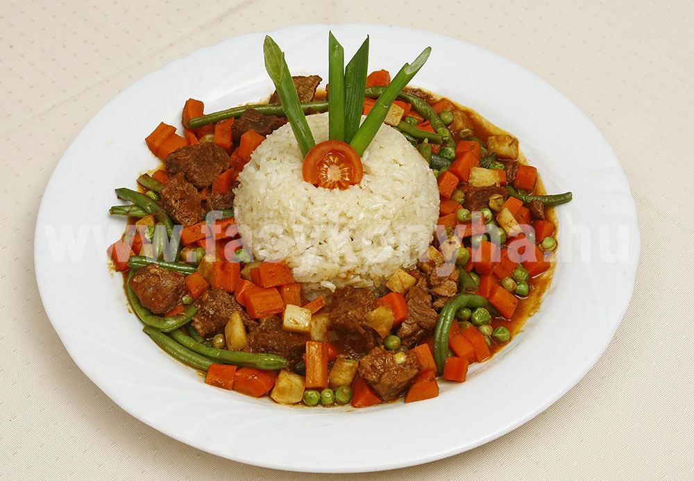 Elkészítési mód:A húst, a tisztított zöldségeket kockákra, a fokhagymát karikákra vágjuk , majd a paradicsomot leforrázzuk, és a héját lehúzzuk. A zöldségeket a zöldborsó kivételével a hússal együtt olajon lesütjük, sóval, borssal ízesítjük és állandó kevergetés mellett kevés folyadék hozzáadásával puhára főzzük. Hozzáadjuk a zöldborsót és pár percig tovább főzzük. Közben a rizst olajon üvegesre pirítjuk, felöntjük 6 dl vízzel, sóval ízesítjük, egészben belerakjuk a tisztított vöröshagymát és addig főzzük, amíg a rizs puha lesz. Lefedjük, kb. 20 percig állni hagyjuk, a hagymát kivesszük belőle és a ragu mellé formázva tálaljuk, ízlésesen díszítjük.