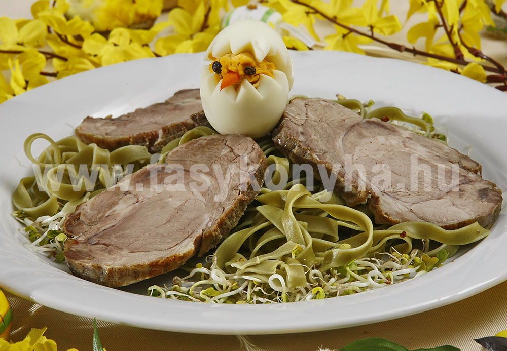 A combot a faggyútól megtisztítjuk. Lábasban a zsírt felhevítjük, majd belerakjuk a sóval, borssal bedörzsölt báránycombot, a darabolt fokhagymát, a hagymát és a petrezselyemzöldjét. Kérget pirítunk, azután felöntjük annyi vízzel, hogy ellepje. Sóval után ízesítjük és alacsony hőfokon két óra hosszáig konfitáljuk (60°C-on abáljuk), majd a tűzről levéve melegen tartjuk. Közben a tojásokat sós vízben keményre főzzük, lehűtjük, héjától megtisztítjuk, éles késsel cikcakkra körbevágjuk. A sárgáját majonézzel simára keverjük, sózzuk, borsozzuk és dresszing zsák segítségével a tojásfehérjébe visszatöltjük, ezután ráhelyezzük a másik fél tojásfehérjét kalapnak. Fekete borsból szemet, répából csőrt készítünk. A metéltet enyhén sós vízben kifőzzük, leszűrjük, és hevített vajban megforgatjuk. Végezetül a felszeletelt hús mellé meghintett retekcsírával és a főtt tojásból készített kis csibével ízlésesen tálaljuk.