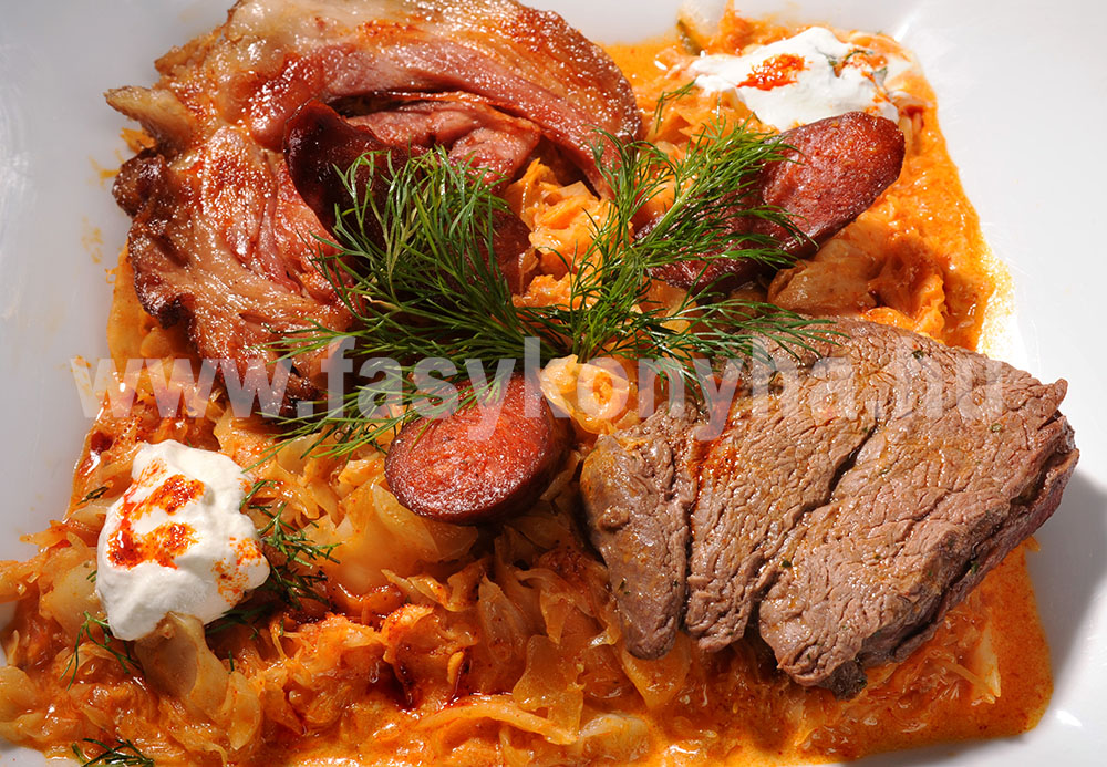 A finomra vágott hagymát, a kaprot és a káposztát olajon megdinszteljük, majd belerakjuk a füstöltcsülköt, és felöntjük annyi vízzel, hogy ellepje. Meghintjük őrölt pirospaprikával, paradicsompürével ízesítjük, borssal fűszerezzük, és egy forralás után lassú tűzön 3 óra alatt, állandó folyadékpótlással puhára főzzük. A csülökből a csontot kihúzzuk, majd fóliába tekerve lehűtjük. A káposztát, a tejföllel simára kevert liszttel behabarjuk, és készre főzzük. A bélszínt és a csülköt szeletekre, a kolbászt karikákra vágjuk, kevés olajon megsütjük, majd feltétként tálaljuk a káposztára. Végezetül kaporral és tejföllel díszítve szervírozzuk.
