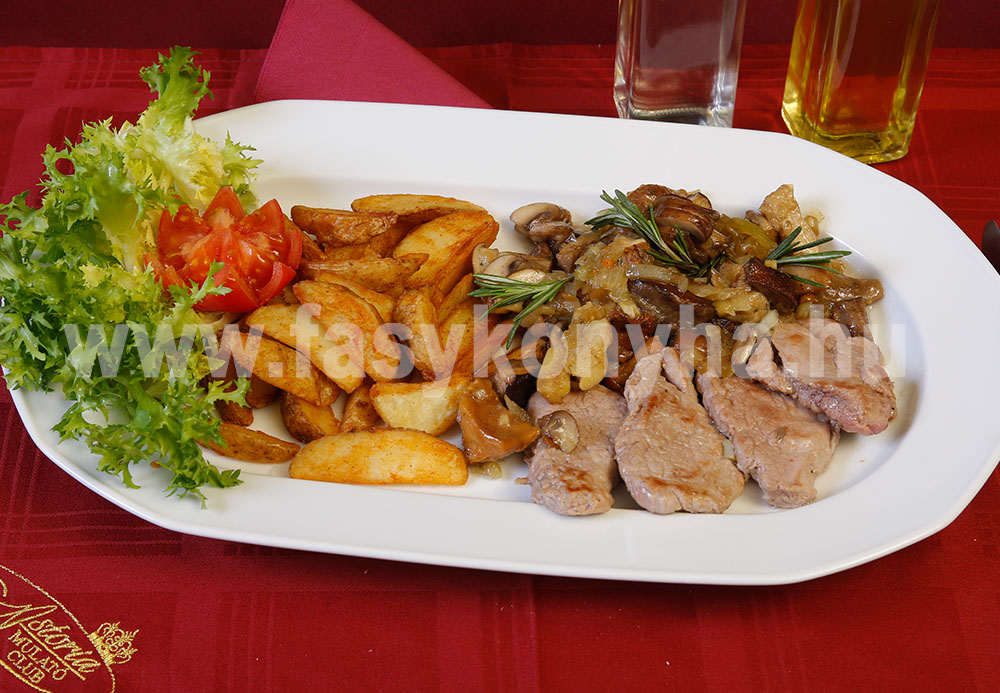 A húst nyolc szeletre vágjuk, sóval ízesítjük, folpackon keresztül enyhén kiklopfoljuk, az olívaolajt felhevítjük és a húsok mindkét oldalát pirosra sütjük. A felkockázott hagymát és a gombát olajon megpirítjuk, sóval ízesítjük, majd a sült húsokat hozzáadjuk és fedő alatt rövid ideig pároljuk. Menet közben a burgonyát meghámozzuk, hasábra vágjuk és forró olajban ropogósra sütjük, majd köretként tálaljuk a gombával együtt a hús mellé. Igény szerint díszítve kínáljuk.