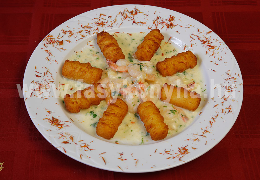 A garnélarákokat megmossuk, vajban megpirítjuk, hozzáadjuk a pépé zúzott fokhagymát, a finomra vágott petrezselyem zöldjét, liszttel meghintjük, összekeverjük, 1 dl vízzel felöntjük, sóval ízesítjük, és állandó kevergetés mellett rövid idő alatt készre főzzük. Burgonyakrokettel esztétikusan tálaljuk.