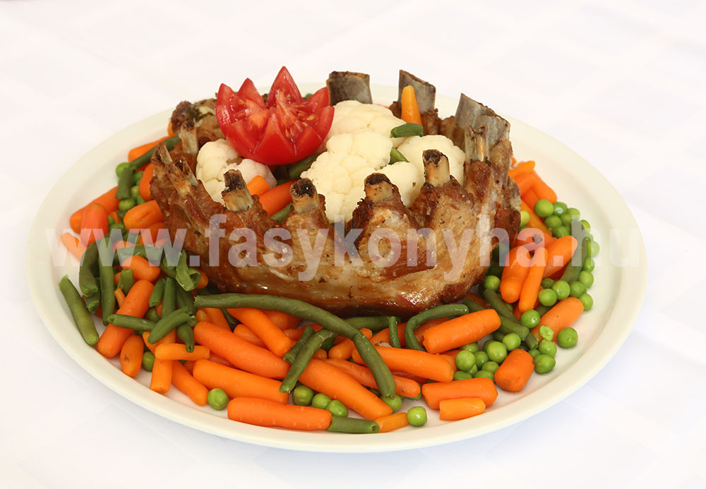 A besózott oldalast egészben kör alakban húsvillával összetűzzük a két végénél, majd madzaggal összekötözzük, a csontok között V alakúra bevágjuk, mint egy koronát. Egy lábasba beleállítjuk, felöntjük annyi vízzel, hogy ellepje, darabolva hozzáadjuk a fokhagymát, a vöröshagymát, sóval, borssal ízesítjük, és félpuhára főzzük. Lecsurgatjuk, tepsibe rakjuk, olajjal meglocsoljuk, majd előmelegített sütőben 150 °C-on szép barnára sütjük. A kötöző madzagot levágjuk, és a hústűt kihúzzuk belőle. A karfiolt rózsáira szedjük, a zöldbabot feldaraboljuk, a zöldborsót kifejtjük, a répát megtisztítjuk, és enyhén sós vízben félpuhára főzzük. Végezetül vajon megpároljuk és köretként tálaljuk a korona sült oldalas mellé.