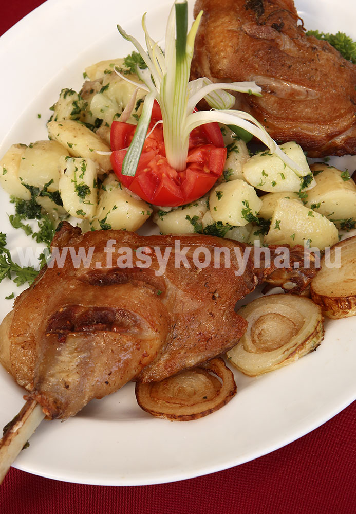 A libacombokat besózzuk, mindkét oldalát olajon megpirítjuk, felöntjük annyi vízzel, hogy ellepje, hozzáadjuk a tört fokhagymát, a tisztított vöröshagymát, szemes borssal, babérlevéllel fűszerezzük, és fedő alatt félpuhára főzzük. A libacombokat a fűszeres léből kivesszük, lecsurgatjuk, és tepsibe rakjuk. 180 °C-os előmelegített sütőben ropogósra sütjük. Közben a kockázott burgonyát enyhén sós vízben megfőzzük. Vajon a finomra vágott petrezselymet megpároljuk, megforgatjuk benne a burgonyát, majd köretként tálaljuk a combok mellé. Tipp: Pirított hagymakarikákkal díszíthetjük.