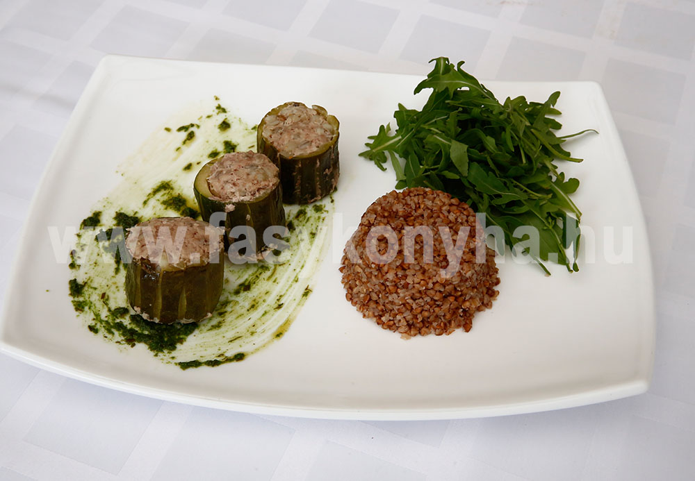 A cukkinit megmossuk, egyenlő részekre feldaraboljuk, belsejét kiszúrjuk, leturmixoljuk, a hengereket félrerakjuk. A rizst megfőzzük, a fokhagymát finomra vágjuk, összekeverjük a cukkinikrémmel, a darált hússal, a felvert tojással, majd sóval, borssal ízesítjük. A tölteléket betöltjük a cukkinihengerekbe. A kész töltött cukkinit tepsibe rakjuk, meglocsoljuk 1 dl vízzel, és 150 fokos előmelegített sütőben, kb. 25-30 perc alatt készre pároljuk. Közben a hajdinát enyhén sós vízben megfőzzük, leszűrjük, majd hozzáadjuk az olajon megdinsztelt vöröshagymát, rövid ideig pároljuk, és köretként tálaljuk a töltött cukkini mellé, az ecettel ízesített rukkolasalátával együtt.