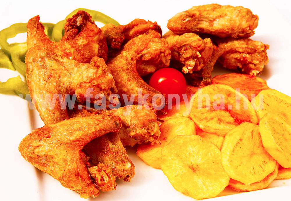 A csirkeszárnyakat átmossuk, enyhén sós vízben előfőzzük, lecsepegtetjük, és forró olajban, a karikára vágott, megtisztított burgonyával együtt ropogósra sütjük. Paprikával és koktélparadicsommal díszítve tálaljuk.