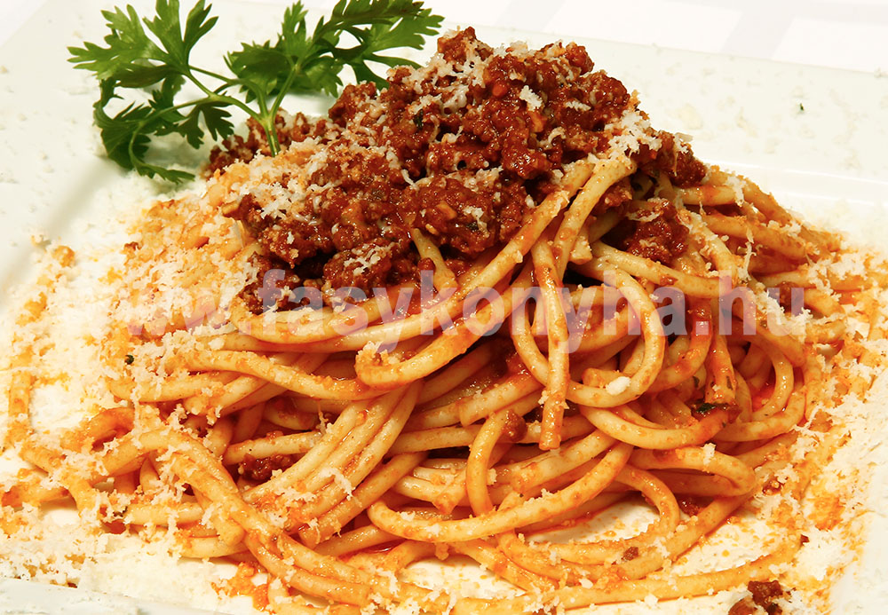 A petrezselymet, a vöröshagymát finomra, a fokhagymát karikákra, a héjától leforrázott paradicsomot kockákra vágjuk. Olajon a hagymát megdinszteljük, hozzáadjuk a fokhagymát, a finomra vágott petrezselymet, a darált húst és szalonnát, sóval ízesítjük, és zsírjára sütjük. Azután belerakjuk a paradicsomot, lepirítjuk, kevés folyadék hozzáadásával megpároljuk. Közben a spagettit enyhén sós vízben, forrástól számítva 8 percig főzzük, majd leszűrjük és összekeverjük a húsos mártással. Reszelt parmezán sajttal megszórva tálaljuk.