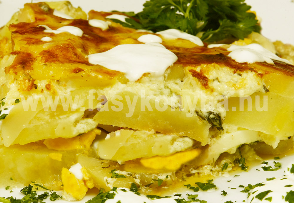 Elkészítési mód:A héjában megfőtt burgonyát hagyjuk hűlni, majd meghámozzuk. A tojásokat keményre főzzük, héjától megtisztítjuk. A hagymát kockára, a burgonyát, a tojást karikákra vágjuk és a sajtot lereszeljük. A hagymát olívaolajon megpirítjuk, azután összekeverjük a tejföllel, a reszelt sajttal és sóval, borssal ízesítjük. A burgonyát kétfelé osztjuk, egyik felét egyenletesen elterítjük a vajjal kikent és zsemlemorzsával megszórt tepsi aljára, majd rátesszük a karikára vágott főtt tojást, leöntjük a sajtos tejföl felével, lefedjük a megmaradt burgonyával, azután egyenletesen elkenjük rajta a maradék sajtos tejfölt. Előmelegített sütőben 200 °C-on szép világosbarnára sütjük. Tálalásnál kockákra vágjuk, tejföllel meglocsoljuk és petrezselyemzöldjével díszítjük.