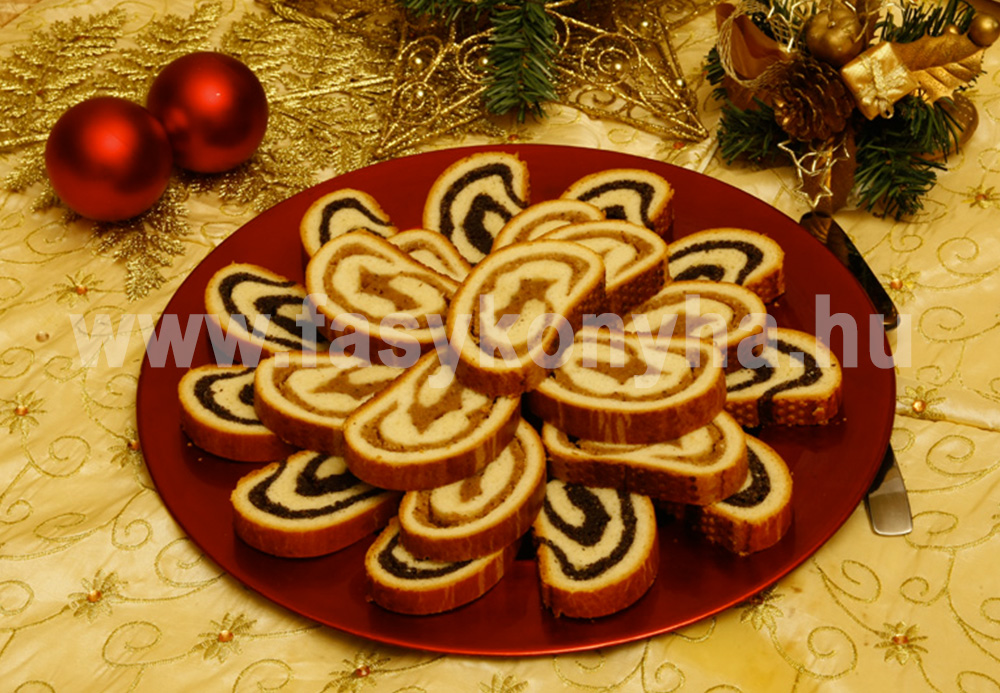Mind a két tölteléket külön-külön tejben megfőzzük. Hagyjuk kihűlni. A megkelt tésztát egyforma adagokra szétosztjuk, téglalap alakúra nyújtjuk, külön-külön elosztjuk rajta a töltelékeket és szépen feltekerjük. Sütőpapírral bélelt tepsibe tesszük, villával megszurkáljuk és jól felvert tojással bőven bekenjük. Két órán át pihenni hagyjuk. 150 °C-os előmelegített sütőben kb. 1 óra alatt szép barnára sütjük. Hagyjuk kihűlni, majd hűvös helyen tároljuk, éles késsel fogyasztás előtt felszeleteljük és tálaljuk. Lehetőleg mindig csak annyit szeljünk fel, amennyi elfogy, mert könnyen kiszárad!